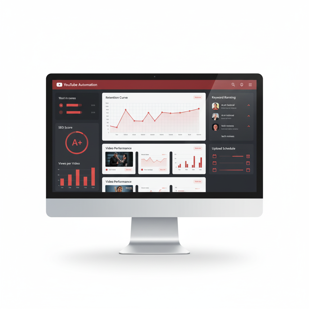 YouTube Automation dashboard showcasing retention tracking, SEO insights, and streamlined publishing workflow.
