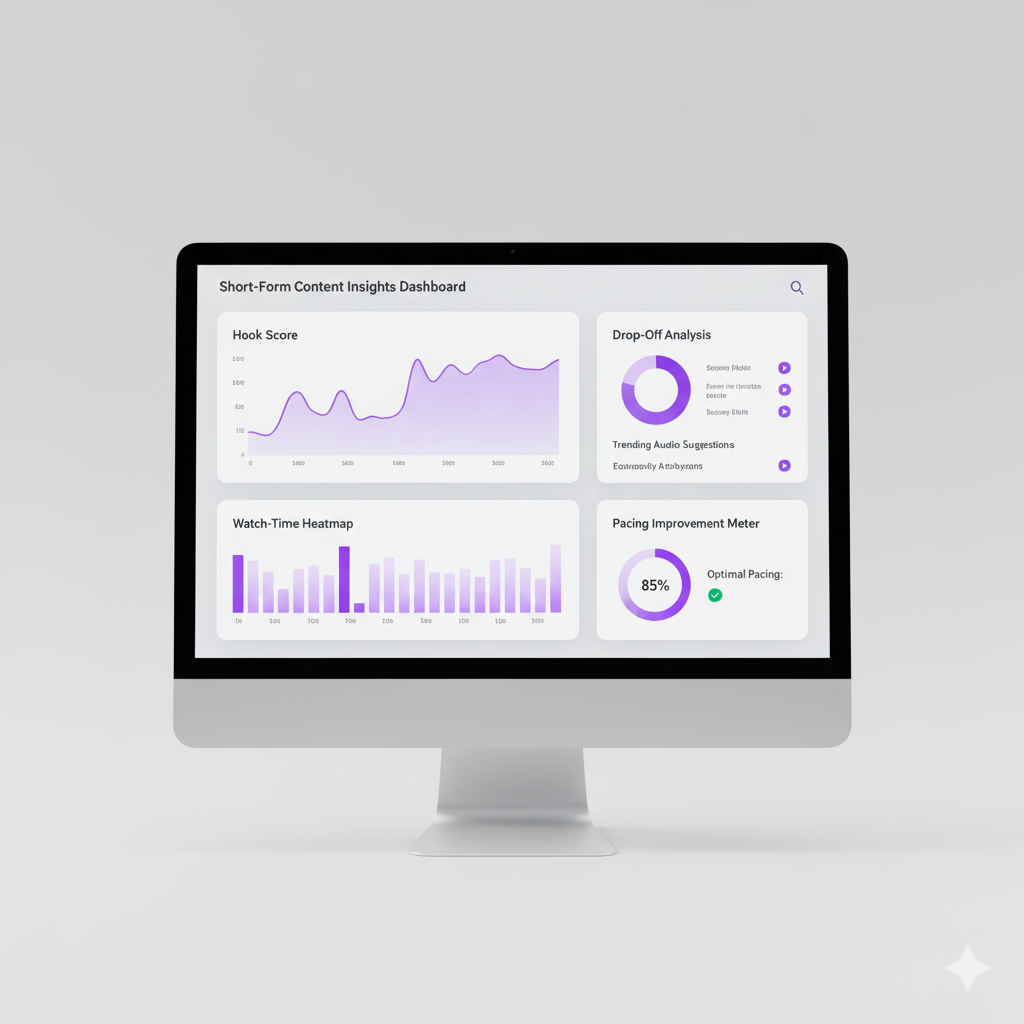 Short-form content insights dashboard highlighting hooks, retention, pacing analysis, and trend performance metrics.