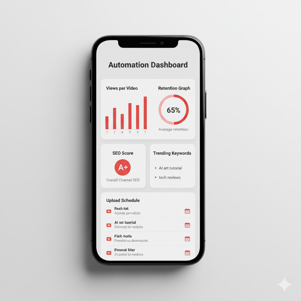 YouTube Automation dashboard showcasing retention tracking, SEO insights, and streamlined publishing workflow.